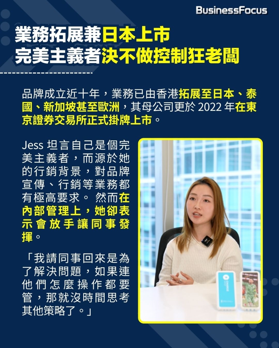 Jess 坦言自己是個完美主義者,而源於她的行銷背景,對品牌宣傳、行銷等業務都有極高要求。 然而,在內部管理上,她卻表示會放手讓同事發揮。