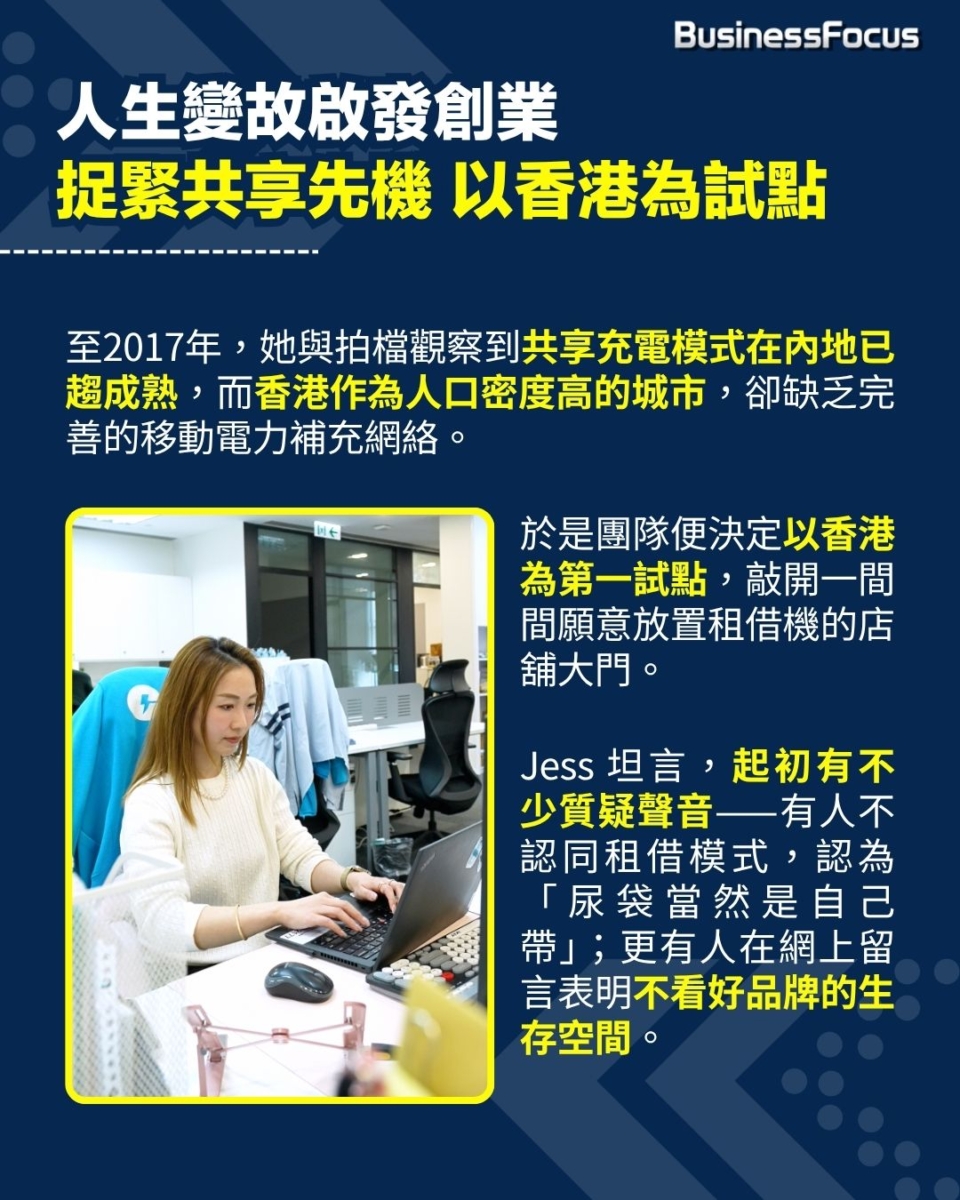 至2017年,她與拍檔觀察到共享充電模式在內地已趨成熟,而香港作為人口密度高的城市,卻缺乏完善的移動電力補充網絡。 於是團隊便決定以香港為第一試點,敲開第一間願意放置租借機的店舖大門。