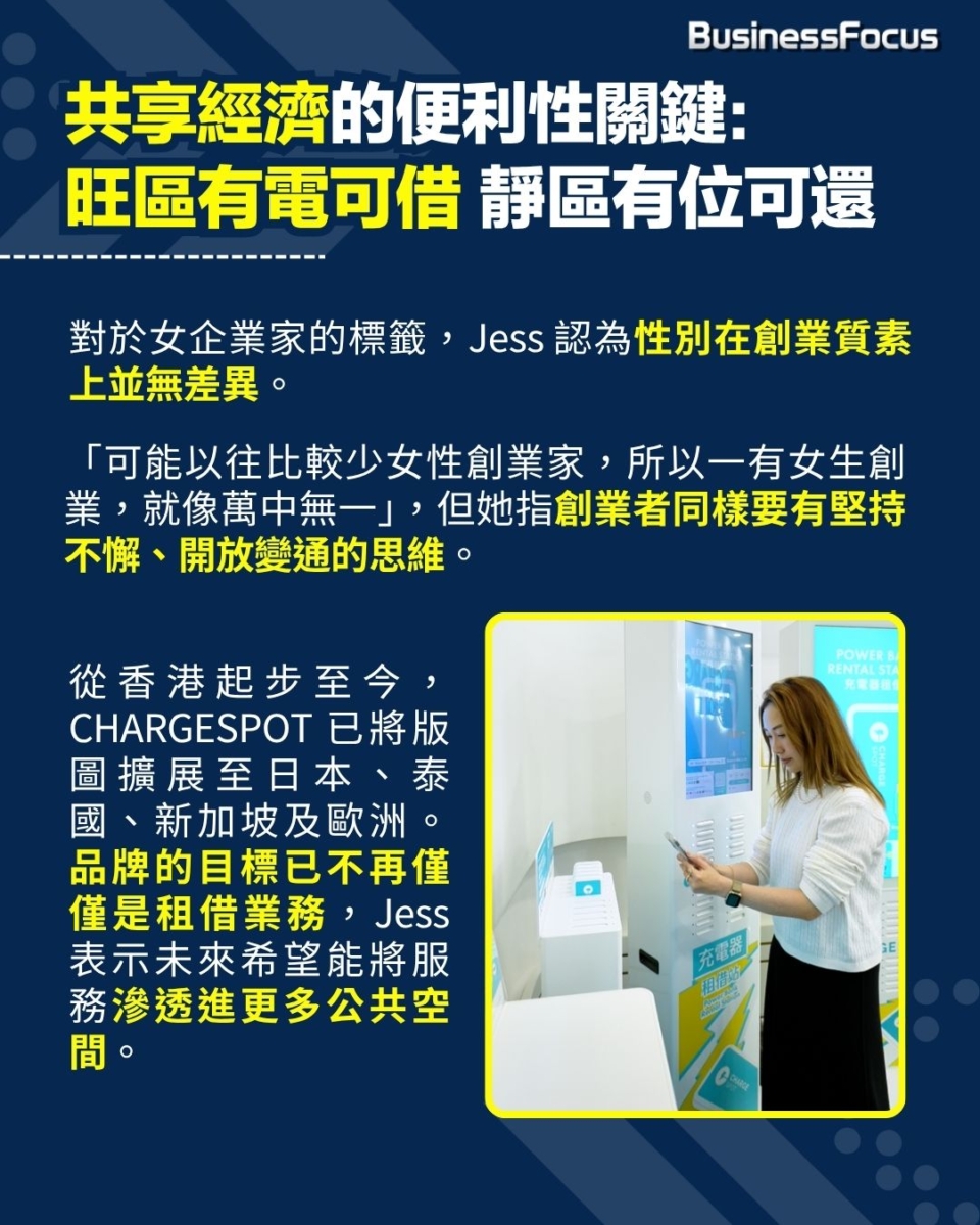 走在香港街頭,不難見到 CHARGESPOT 租借點,而品牌背後的聯合創辦人鄭煒燕(Jess Cheng)從最初安穩打工,到創業被質疑,再到如今成功在共享經濟路上站穩陣腳、與多個國際品牌聯乘。這位女創業家背後又經歷過哪些辛酸?