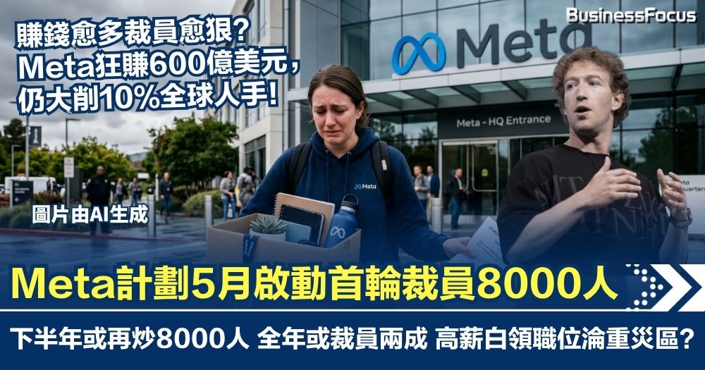 賺錢愈多,員工愈少?據多間媒體報道,科技巨頭Meta(美股代碼:META)雖然去年狂賺約4680億港元,卻計劃於下月即5月20日啟動新一輪大規模裁員,預計裁減約8,000名員工,佔全球員工總數的10%。更令員工心寒的是,公司內部評估下半年恐將再進行第二波裁員,意味年底前或會再有多8000人被炒,裁員百分比有機會暴升至兩成。Meta今次是在財務極度穩健下主動「換血」,反映AI確實正取代大量高薪白領崗位,這場裁員潮正改寫科技業的招聘邏輯。