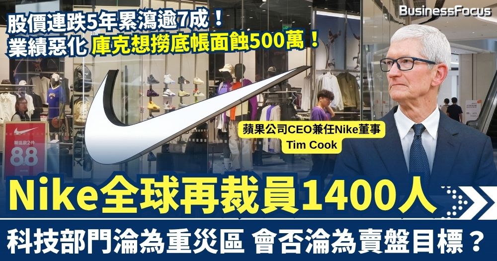 股價連跌5年累瀉逾7成 Nike全球再裁員1400人 科技AI部門淪為重災區 蘋果CEO撈底帳面蝕500萬港元