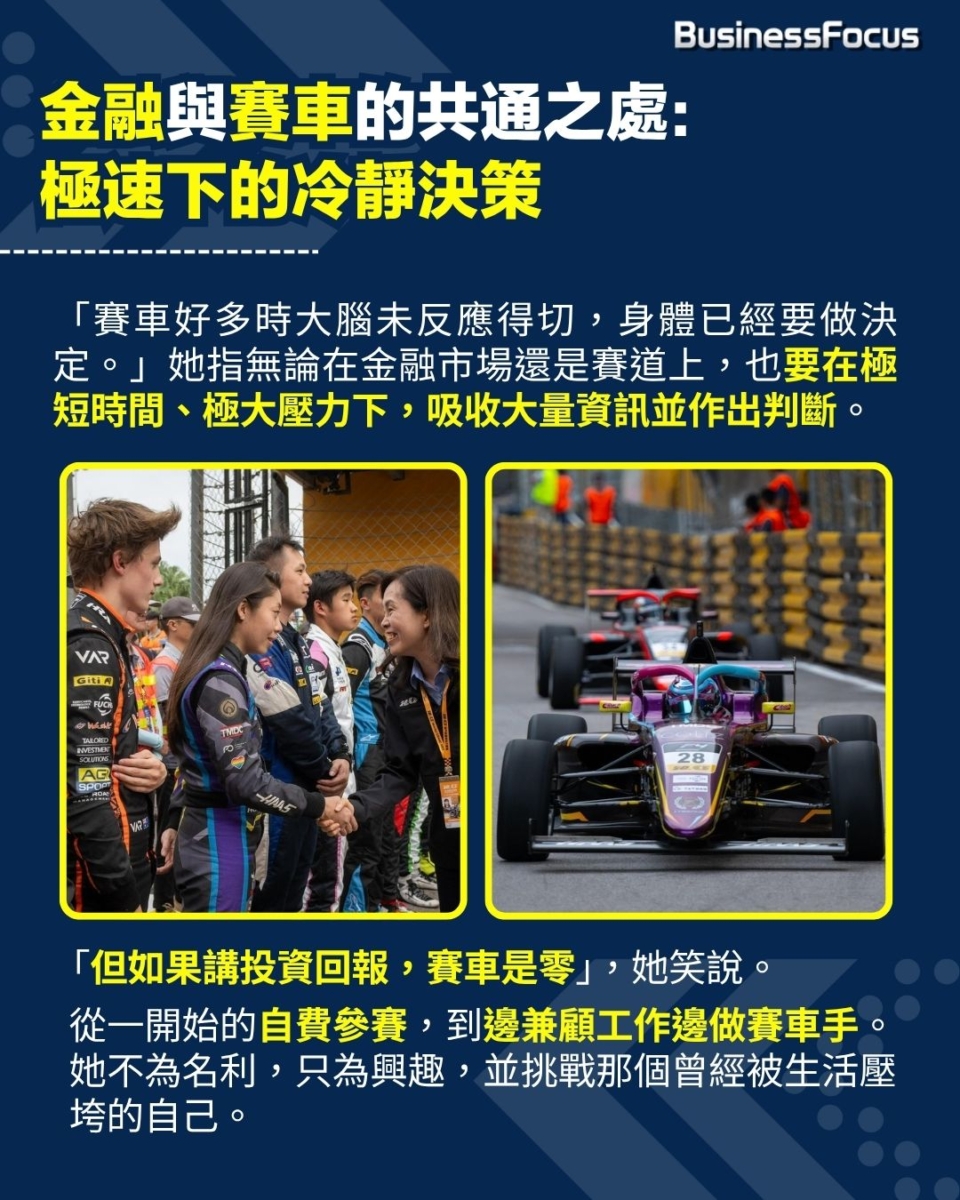 「賽車時速度極高,好多時大腦未反應得切,身體已經要做決定。」她解釋,無論在金融市場還是賽道上,也要在極短時間、極大壓力之下,吸收大量資訊並作出判斷。