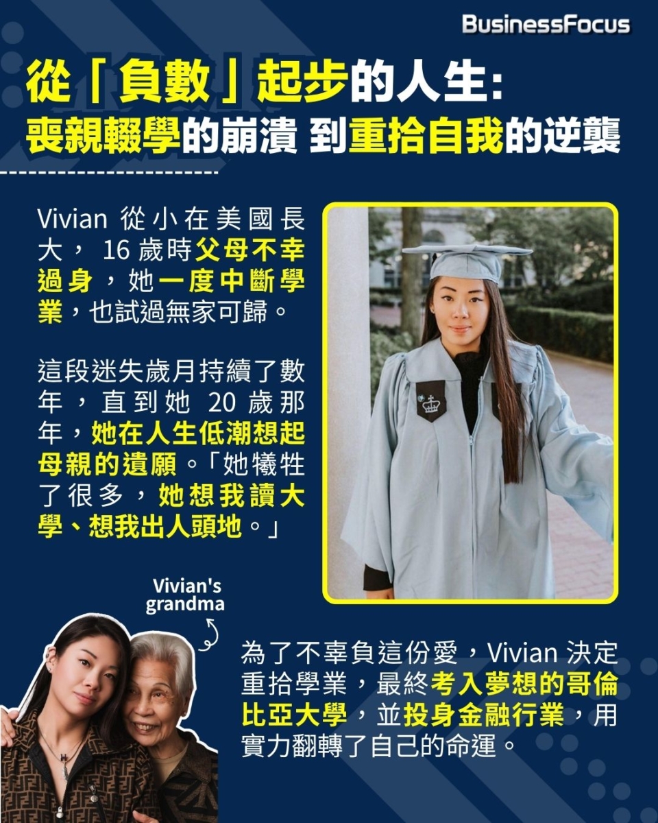 為了不辜負這份愛,Vivian 決定重拾學業,最終考入夢想的哥倫比亞大學,並投身金融行業,用實力翻轉了自己的命運。