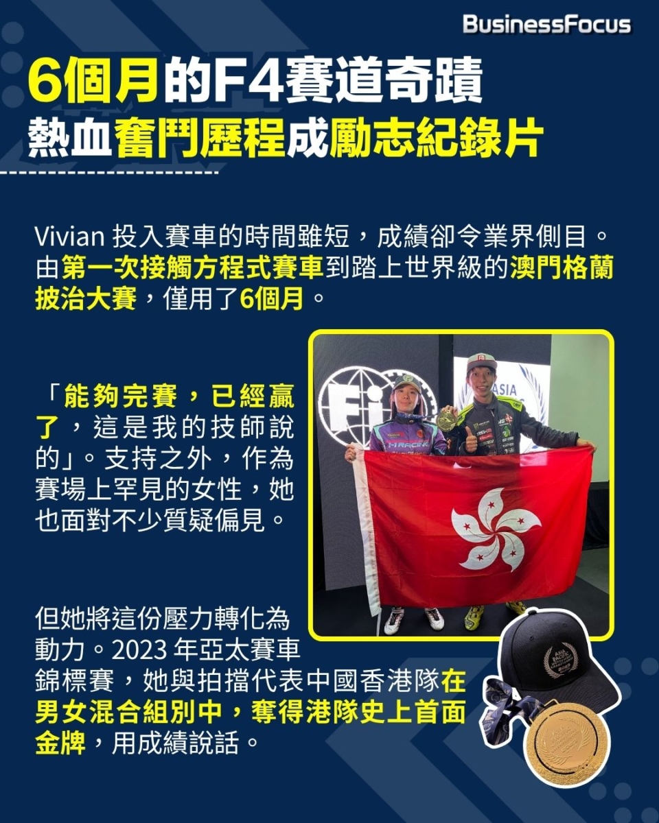 「能夠完賽,已經贏了,這是我的技師說的」,作為賽場上罕見的女性面孔,Vivian 面對過不少質疑與偏見。但她將這份壓力轉化為動力。2023 年亞太賽車錦標賽,她與拍擋代表中國香港隊在男女混合組別中,奪得港隊史上首面金牌,用成績說話。