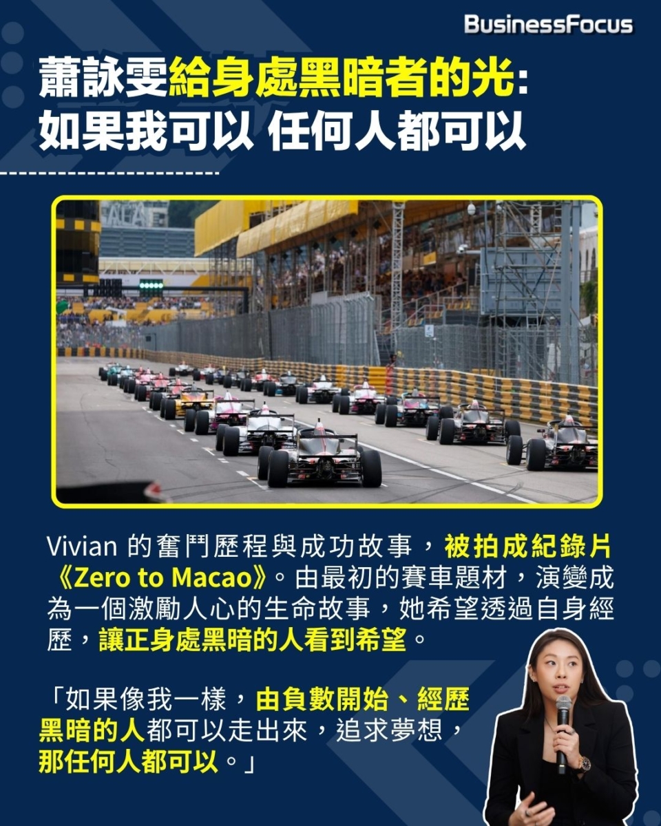 「如果像我一樣,由負數開始、經歷黑暗的人都可以走出來,追求夢想,那任何人都可以。」蕭詠雯用她的逆襲人生告訴大眾:無論起點在哪裡,只要不放棄,賽道的終點永遠有光。