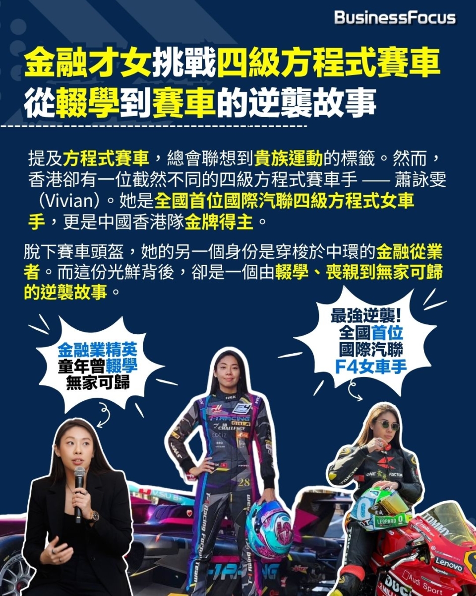 提及方程式賽車,總會聯想到貴族運動的標籤。然而,香港卻有一位截然不同的四級方程式賽車手 —— 蕭詠雯(Vivian)。她是全國首位國際汽聯四級方程式女車手,更是中國香港隊金牌得主。