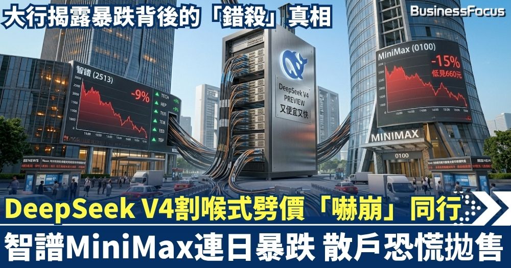 中國AI界正上演一場血流成河的「內捲」大戰!主打「又便宜又快」的DeepSeek V4預覽版橫空出世,以破底價姿態殺入市場,瞬間引發投資者恐慌拋售 。同業龍頭智譜(2513)與MiniMax(0100)股價上周五雙雙插水9% 。當中MiniMax跌勢未止,今日盤中更一度暴瀉15%,股價低見660元,連續三日慘遭血洗,創下兩個月以來的低位 。而智譜今日也一度跌超6%,低見872元。表面上看,一場零和互鬥似乎要令整個板塊兩敗俱傷,但狂跌背後,究竟是基本面全面崩壞,還是資本市場精心策劃的一場洗盤?