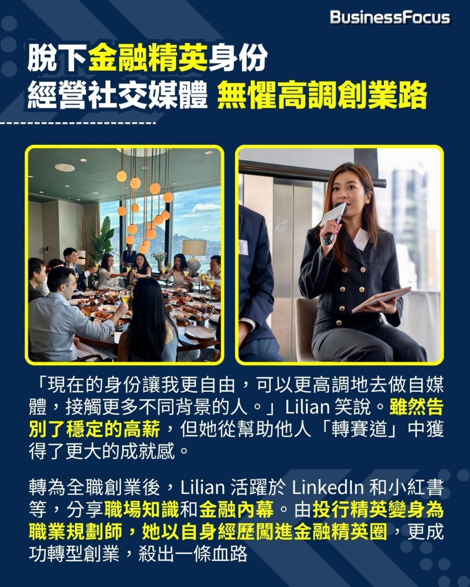 轉為全職創業後,Lilian 從以前在銀行工作,受限於合規和形象,到現在活躍於 LinkedIn 和小紅書等,分享金融職場。