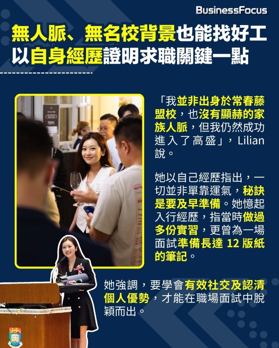 「我並非出身於常春藤盟校,也沒有顯赫的家族人脈,但我仍然成功進入了高盛」,Lilian 以自己經歷指出,一切並非單靠運氣,秘訣是要及早準備。她憶起入行經歷,指當時做過多份實習,更曾為一場面試準備長達 12 版紙的筆記。
