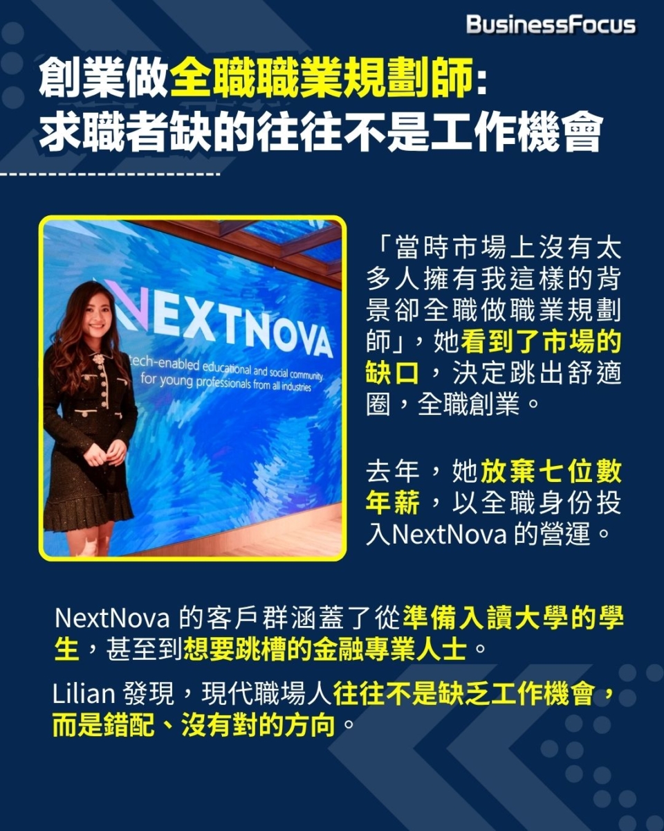 NextNova 的客戶群涵蓋了從準備入讀大學的學生,甚至到想要跳槽的金融專業人士。Lilian 發現,現代職場人往往不是缺乏工作機會,而是錯配、沒有對的方向。