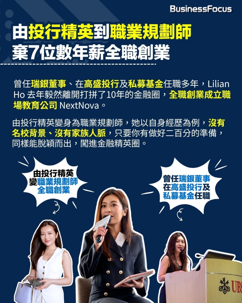 曾任瑞銀董事、在高盛投行及私募基金任職多年,Lilian Ho 去年毅然離開打拼了10年的金融圈,全職創業成立職場教育公司 NextNova。由投行精英變身為職業規劃師,她以自身經歷為例,沒有名校背景、沒有家族人脈,只要你有做好二百分的準備,同樣能脫穎而出,闖進金融精英圈。