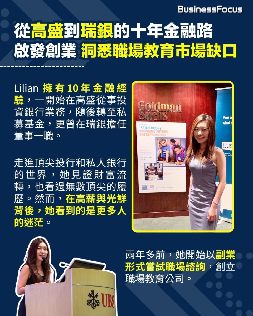 Lilian 擁有10年金融經驗,一開始在高盛從事投資銀行業務,隨後轉至私募基金,更曾在瑞銀擔任董事一職。走進頂尖投行和私人銀行的世界,她見證財富流轉,也看過無數頂尖的履歷。然而,在高薪與光鮮背後,她看到的是更多人的迷茫。