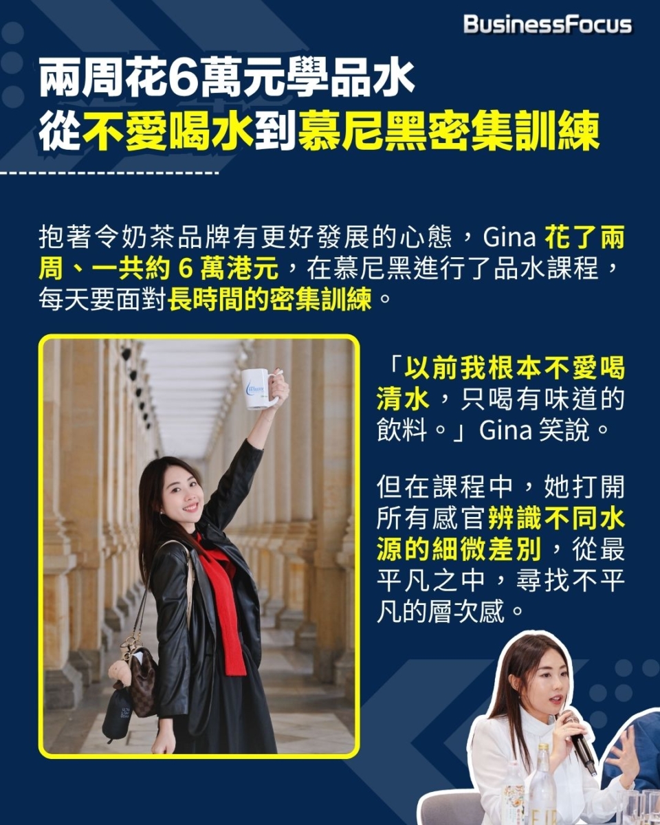 抱著令奶茶品牌有更好發展的心態,Gina 花了兩周、一共約 6 萬港元,在慕尼黑進行了品水課程,每天要面對長時間的密集訓練。