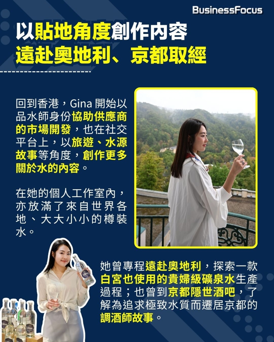 回到香港,Gina 開始以品水師身份協助供應商的市場開發,也在社交平台上,以旅遊、水源故事等角度,創作更多關於水的內容。在她的個人工作室內,亦放滿了來自世界各地、大大小小的樽裝水。