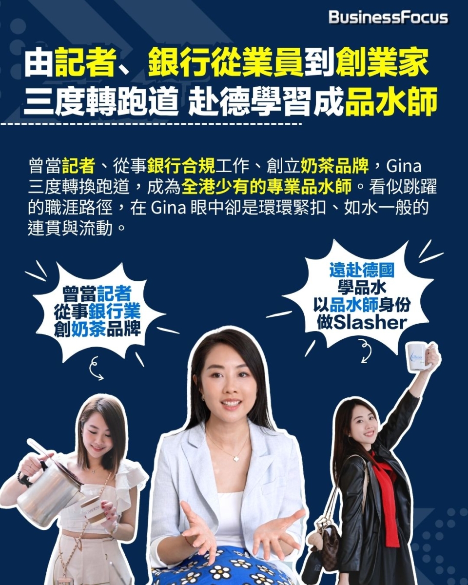 「飲水」似乎是與生俱來的技能,但學習「品水」卻是一門專業課題。曾當記者、從事銀行合規工作、創立奶茶品牌,Gina 三度轉換跑道,成為全港少有的專業品水師。看似跳躍的職涯路徑,在 Gina 眼中卻是環環緊扣、如水一般的連貫與流動。
