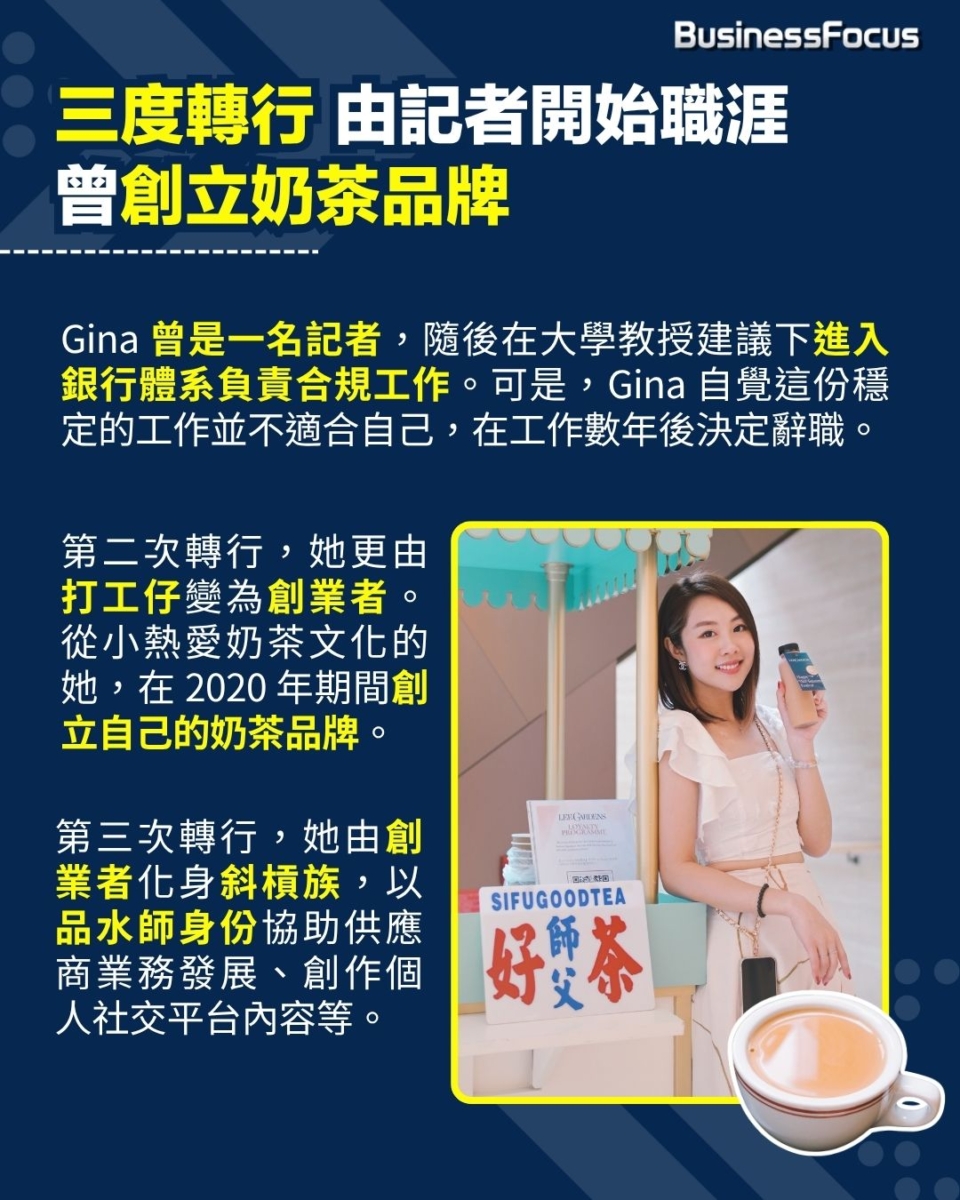 Gina 曾是一名記者,隨後在大學教授建議下進入銀行體系負責合規工作。可是,Gina 自覺這份穩定的工作並不適合自己,在工作數年後決定辭職。