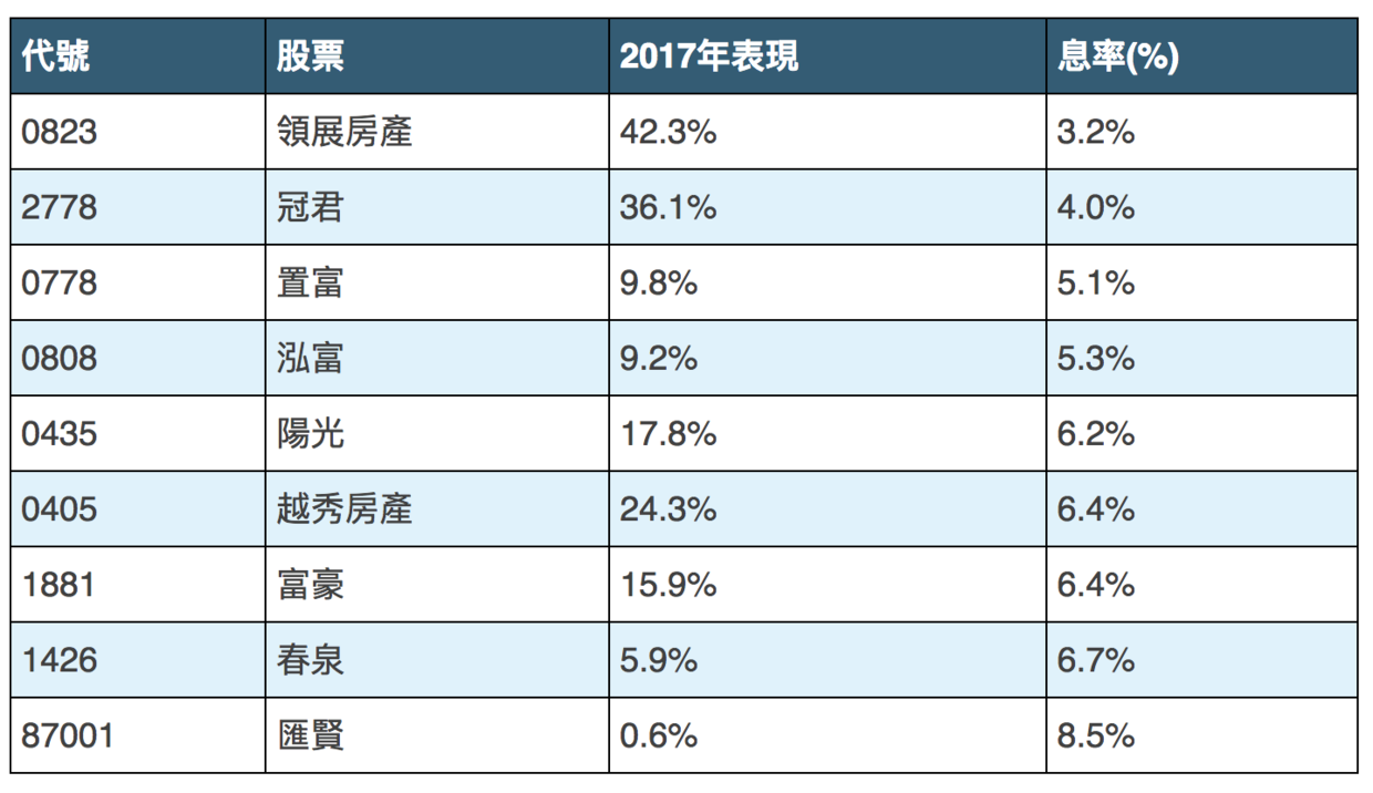 香港市場上有11支REITs,其中1支停牌,1支成交較少,其餘9支REITs在2017年的收益都不錯(如下圖)。