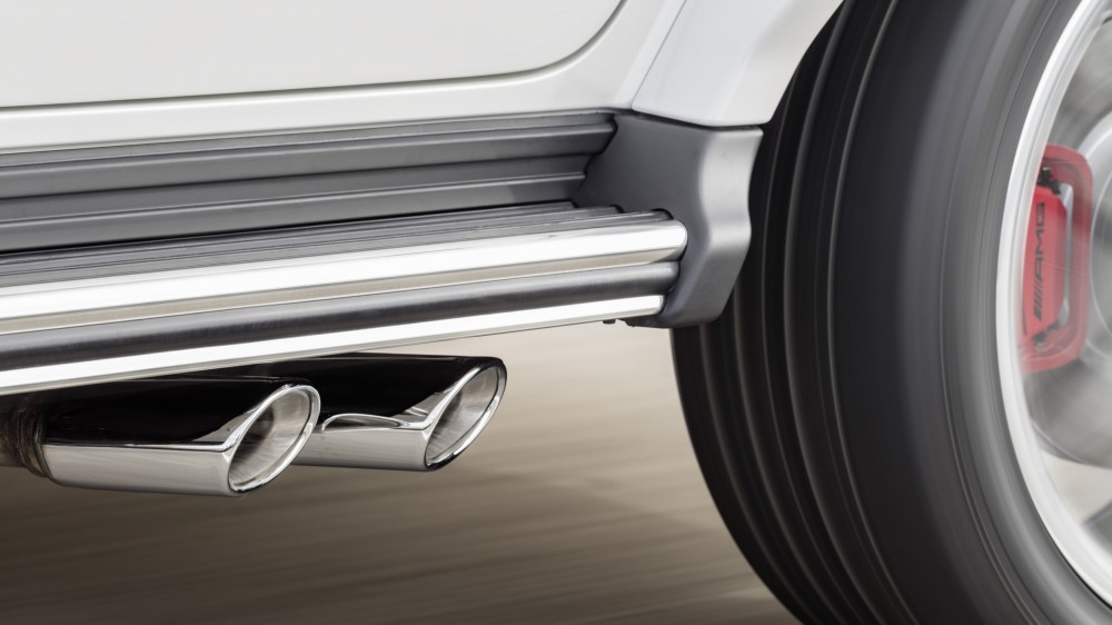 底盤方面,G63採用的是AMG Performance 4Matic四輪驅動系統,輸出主要是以前40%、後60%偏向後驅的形式傳輸,前後輪軸上皆增加了橫向穩定器,並且也配備了能適應多種路況的墊子氣壓避震器。雖然此款G63較偏向於公路性能,但依舊有亮眼的越野性能,具有三種越野模式:沙地、泥地以及礫石。