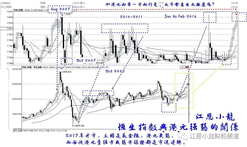 打開港匯的圖表,我們發現幾次港匯的走勢一旦由弱方保證轉到强方保證,或由强轉弱,股市大多會出現轉角市。如2007年8月份恒指出現大奇迹日,當時港匯處于7.82水平之後一直到2007年10月份轉强到7.75水平股市見頂;2010-2011年港匯由弱轉强,之後股市歐債危機見頂回調;2016年1月份港匯由突然月初急跌至7.82水平之後,2月開始回落,股市同時見底。2017年的牛市港匯由2016年12月在强方7.75水平一直轉弱,直到今天7.84水平。同時間美匯指數亦有104的水平回調至今天的90水平。讀者不難想像是港股的升浪跟資金流有關。美匯指數下跌,同時人民幣上升,這令到港股資産對持有人民幣的投資者變得吸引,而港匯同時轉弱令港股「打折」。但讀者必須要留意一旦美匯反彈,及港匯由現在弱方保證轉向强方,就要小心牛轉熊。