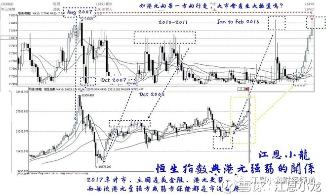 打開港匯的圖表,我們發現幾次港匯的走勢一旦由弱方保證轉到强方保證,或由强轉弱,股市大多會出現轉角市。如2007年8月份恒指出現大奇迹日,當時港匯處於7.82水平之後一直到2007年10月份轉强到7.75水平股市見頂;2010-2011年港匯由弱轉强,之後股市歐債危機見頂回調;2016年1月份港匯由突然月初急跌至7.82水平之後,2月開始回落,股市同時見底。2017年的牛市港匯由2016年12月在强方7.75水平一直轉弱,直到今天7.84水平。同時間美匯指數亦有104的水平回調至今天的90水平。讀者不難想像是港股的升浪跟資金流有關。美匯指數下跌,同時人民幣上升,這令到港股資産對持有人民幣的投資者變得吸引,而港匯同時轉弱令港股「打折」。但讀者必須要留意一旦美匯反彈,及港匯由現在弱方保證轉向强方,就要小心牛轉熊。