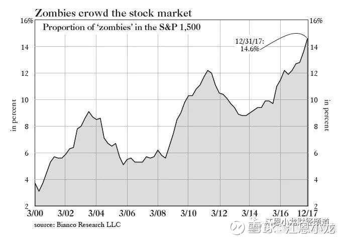 自金融海嘯以來,美國高息債券到2014年發行超過1兆美元。美國公司由低息環境下,可以以極底息下去融資,而跟據資料顯示,目前在標普500指數成份股中約有14%是爲僵尸股,「殭屍股」,定義是企業的利息開支高于其3年平均稅前盈利,預示一旦利率加速上揚,將遇到融資問題,現金流隨時斷裂。