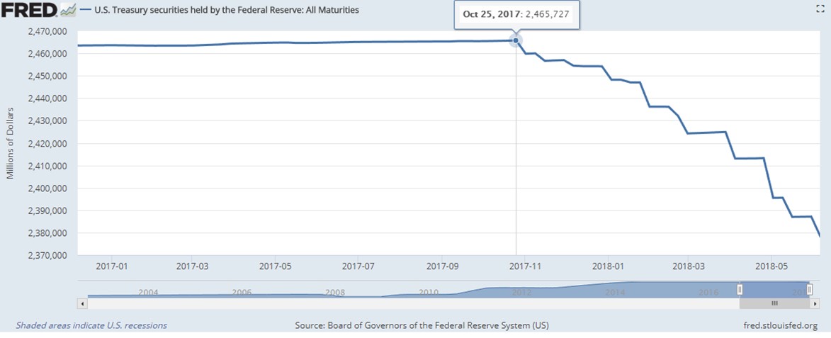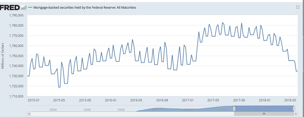 但我們之前提出過,美聯儲持有的美國長短國債的圖表,由2017年10月開始到2018年5月31日那個星期計,美聯儲由USD2,465,727,000,000减至USD2,387,103,000,000。因爲爲期7個月,即每個月約100億美元,比之前公布的60億爲高。其次爲按揭抵押債券(MBS),因爲 MBS 支付不同于一般債券的特殊性,有時减債的傳遞,會出現 2-3 個月的延遲,才能真正反映在資産負債表上。由2017年10月計到2018年5月,共减少約480億美元。即每月减少約68億。即是每個月减少了168億美元的速度縮表。