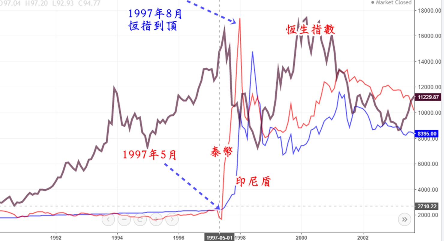 而我相信,如果下半年的美元持續加息,及加快縮表。新興市場問題將會持續及惡化。參考97年的經驗,當時先由一些弱小的經濟體如泰國等出事,其後再波及其他的經濟及外匯儲備比較好的如亞洲四小龍,如台灣,新加坡及香港等。資金將會回流去美國。今次筆者預期亦不例外。泰幣及印尼盾在1997年5月出事(如上圖),恒指或因資金從這些國家套現流入,之後再因問題惡化在同年1997年8月見頂,10月正式發生問題。所以筆者認爲一旦今年新興市場出事,香港很難不會受到波及。