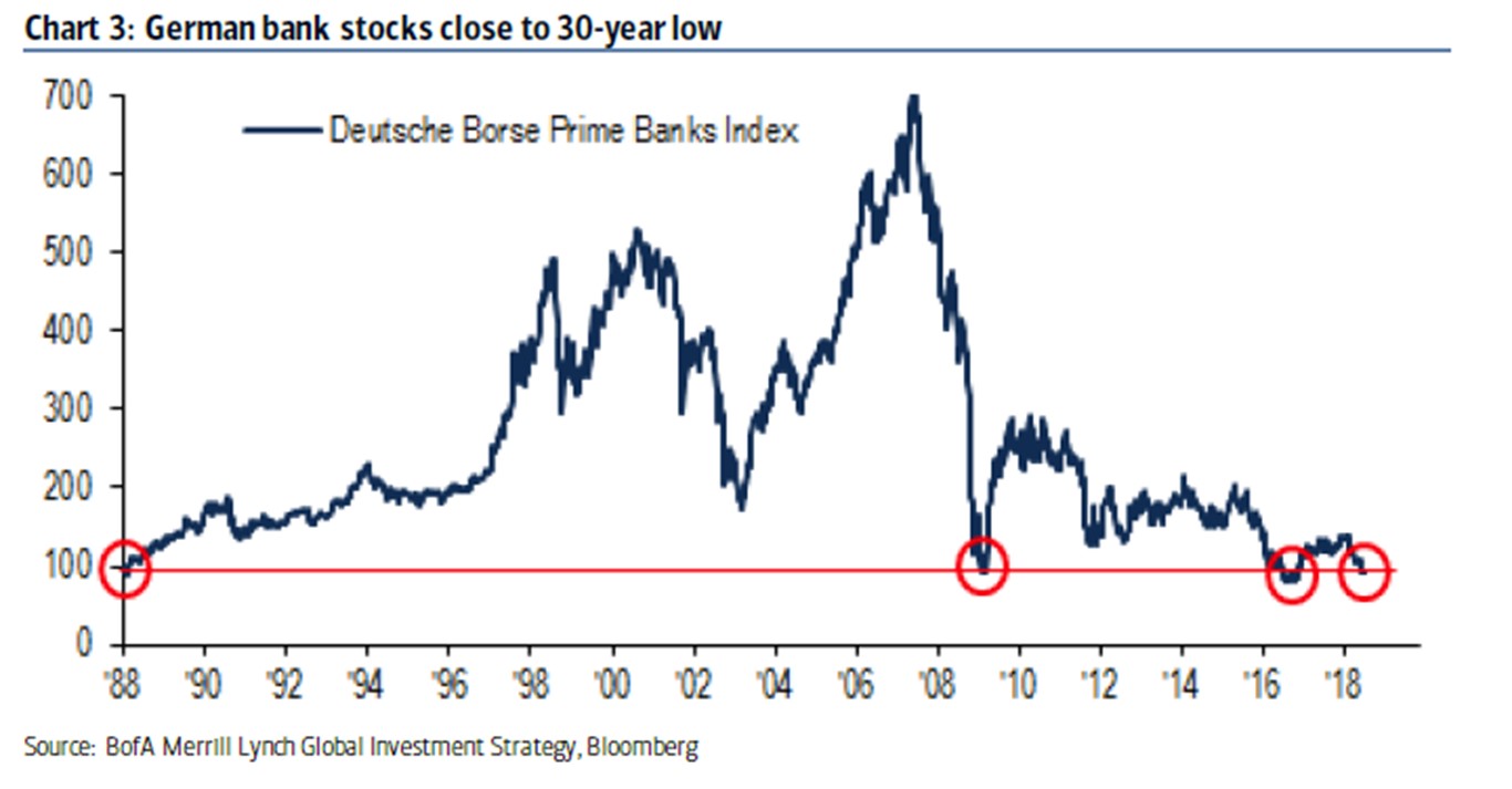 德國的銀行股股價亦大幅下滑,早前聯儲局公布35間美國大型銀行第二輪壓力測試結果,只有德意志銀行未能通過。德銀市值大幅下滑可能預示著該行將退出一個主要歐洲指數,從而危及到該行在追踪基準股指的大型基金中的地位。股價下跌的情况同樣出現在美國銀行股身上,如高盛都大幅下跌。投資者可能預期銀行手上持有大量高息債券,在升息下銀行可能會出現虧損。