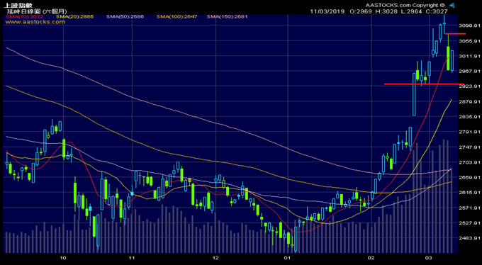 內地股票市場農歷年後升勢強勁,滬深及創業板三大指數累漲20%至30%,中央即使想要股市走強,也不會想指數大幅爆升至過熱,形成泡沫,再引發股災,所以作出這次人為調整也是意料之中。上週五滬指瀉達4.4%,A股3000多隻股票齊跌。預計A股會升在3100以下先行整固,但中央亦不會想股市大跌以至破壞整個上升形態,故相信2920位置可以一守。