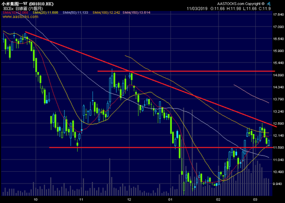 圖表上股價在$10元邊築底回升,仍然受阻於下降軌,但相信於$11.5有支持,3月19號公佈業績,資金有機會率先入場炒作,如突破下降軌及近期高位$12.6,有望挑戰上年第四季高位$15水平。